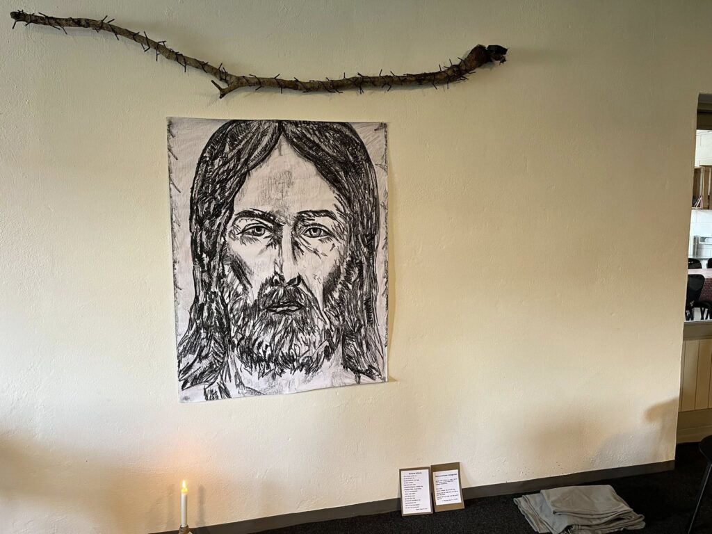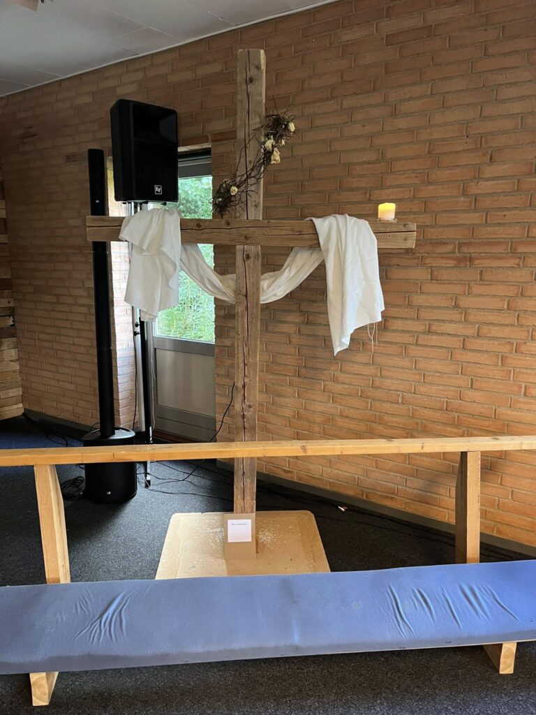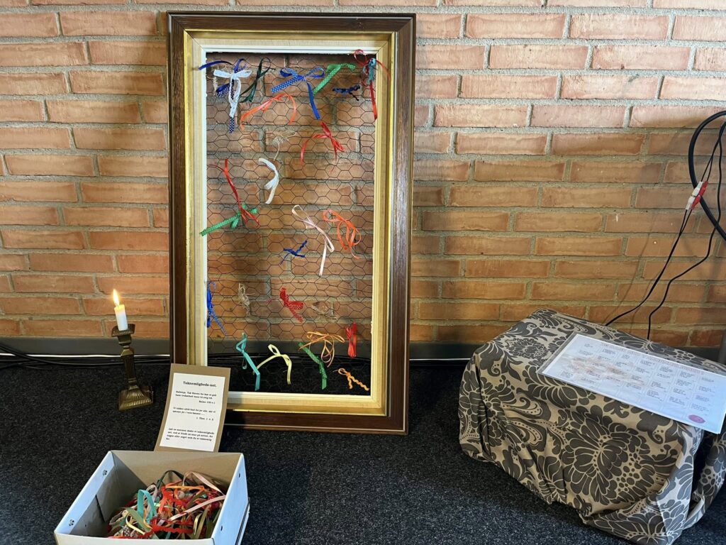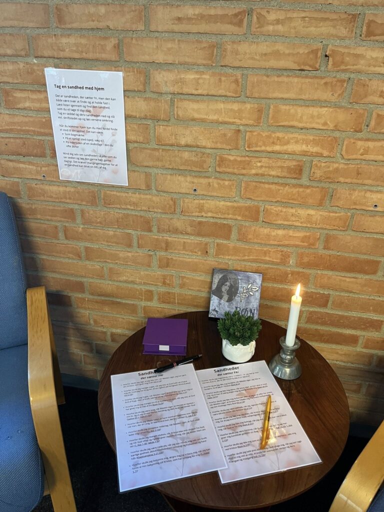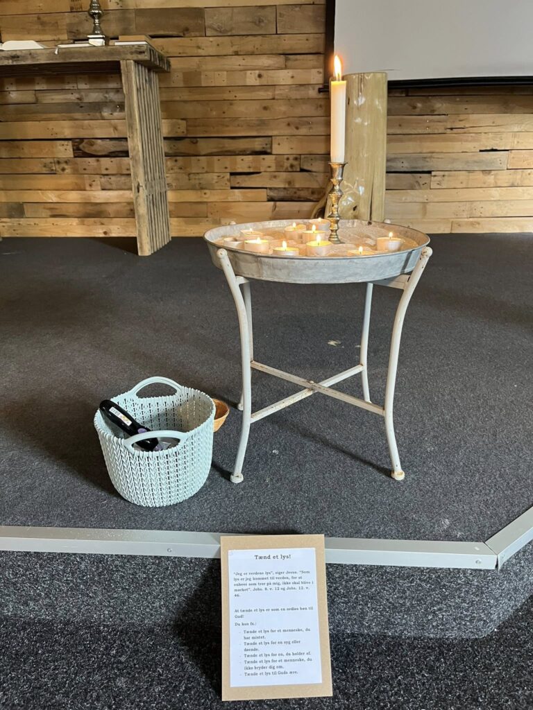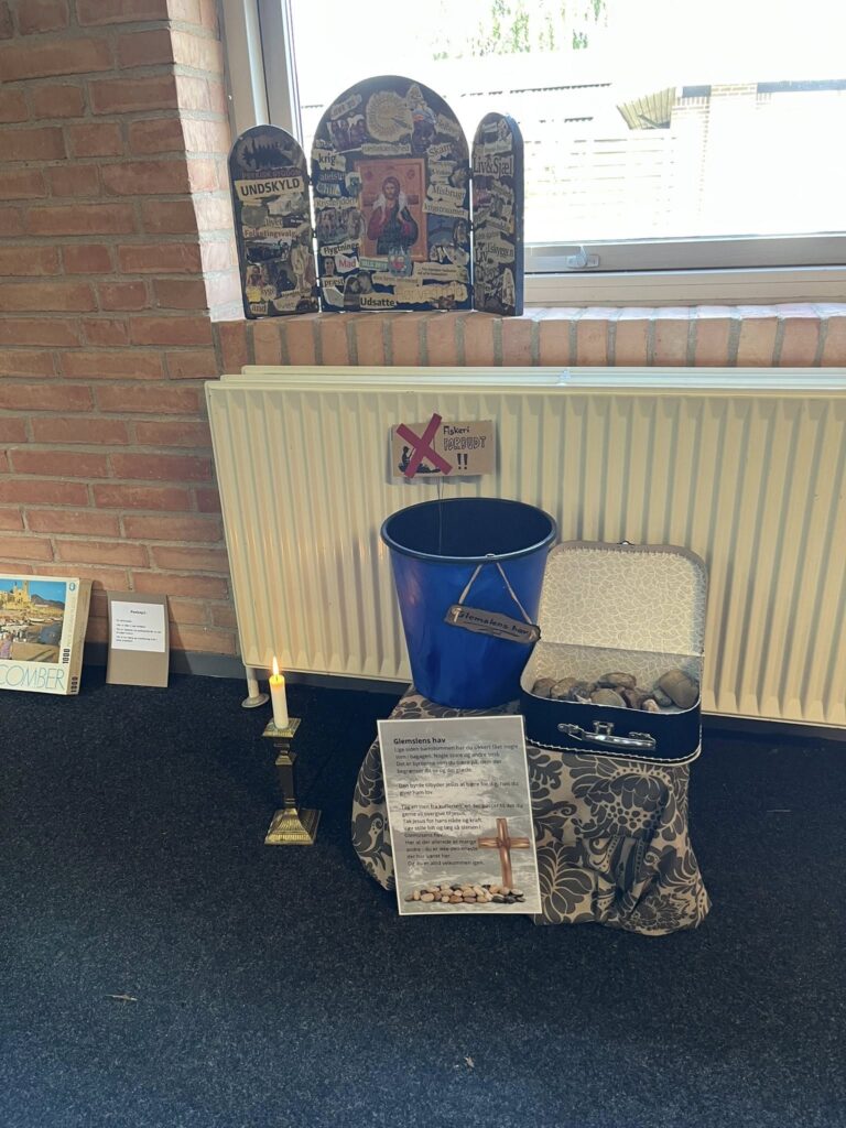 Vi har indrettet små stationer rundt om i kirkerummet, som giver mulighed for stilhed, refleksion og bøn. Her kan du sætte tempoet ned, finde et øjebliks fred og bare være til stede.